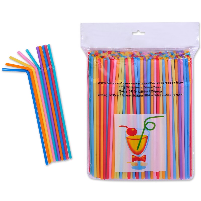 250 броя коктейлни сламки, изработени от плътна пластмаса в различни цветове с огъваща се зона.