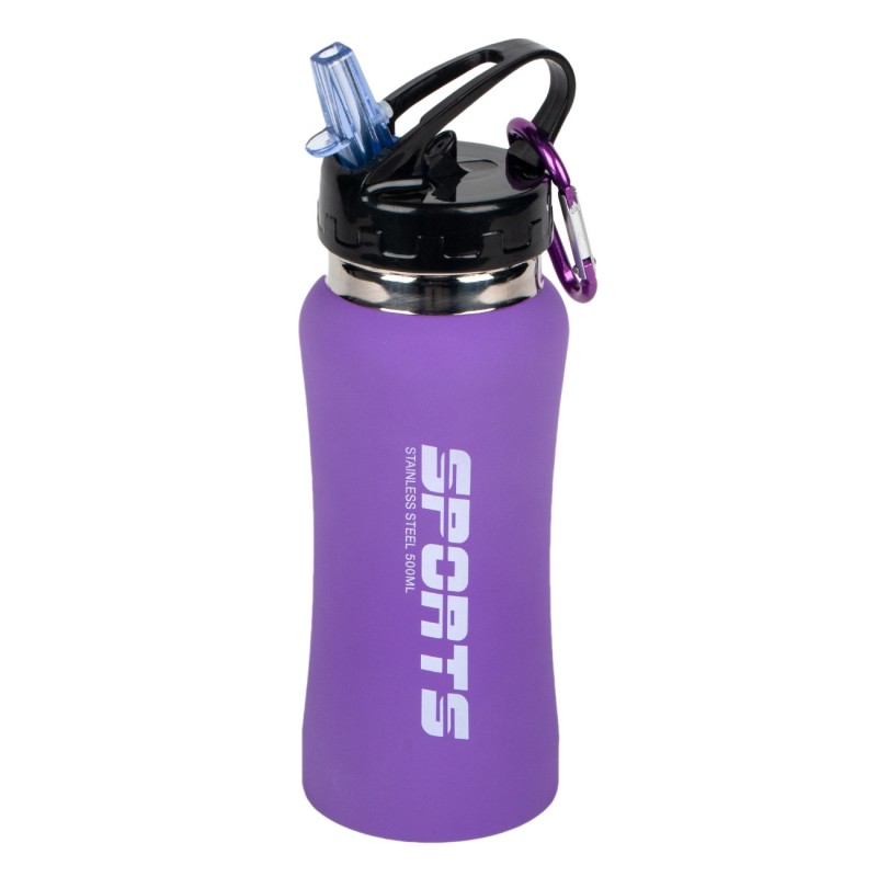 Бутилка за вода за фитнес и спорт, изработена от висококачествена качествена неръждаема стомана в лилав цвят с надпис Sports и практична закачалка тип карабина.