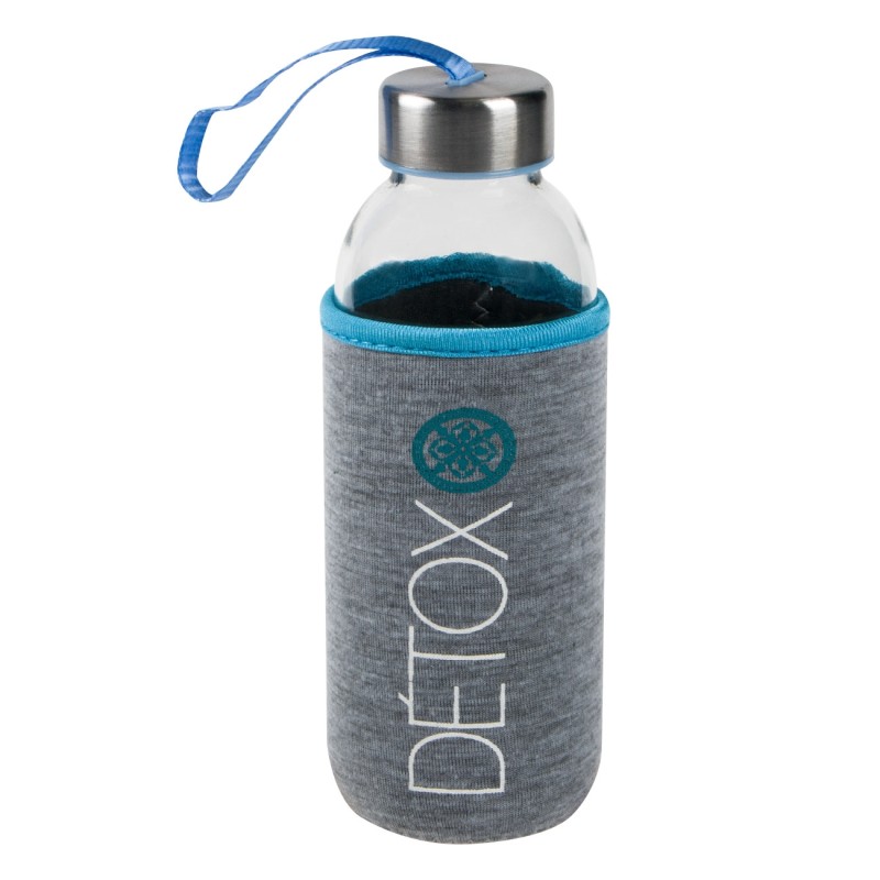 Прозрачна бутилка за вода за фитнес и спорт, изработена от висококачествено плътно стъкло с текстилен калъф в сиво и светло синьо.