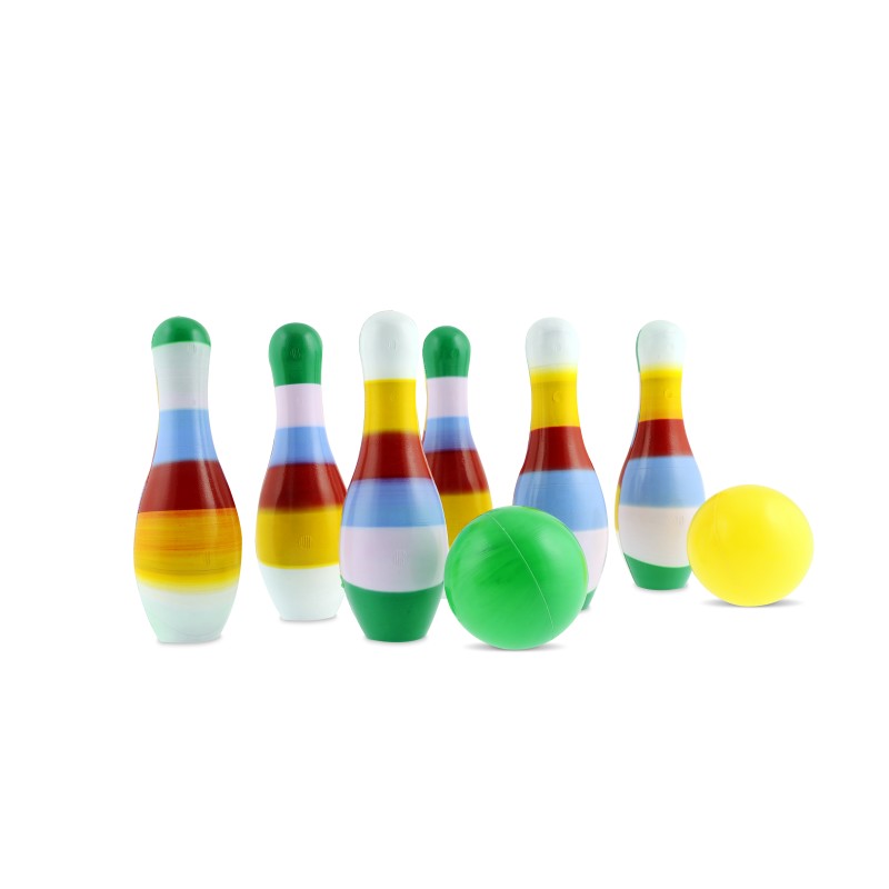 Детски комплект за боулинг - 6 кегли в многоцветно райе и 2 топки, изработени от качествена и безвредна пластмаса.
