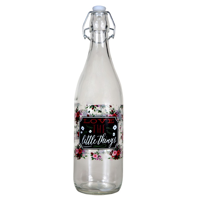 Бутилка за вода, изработена от висококачествено стъкло с многоцветен флорален принт, надпис Love the little things и подвижна запушалка в бял цвят.