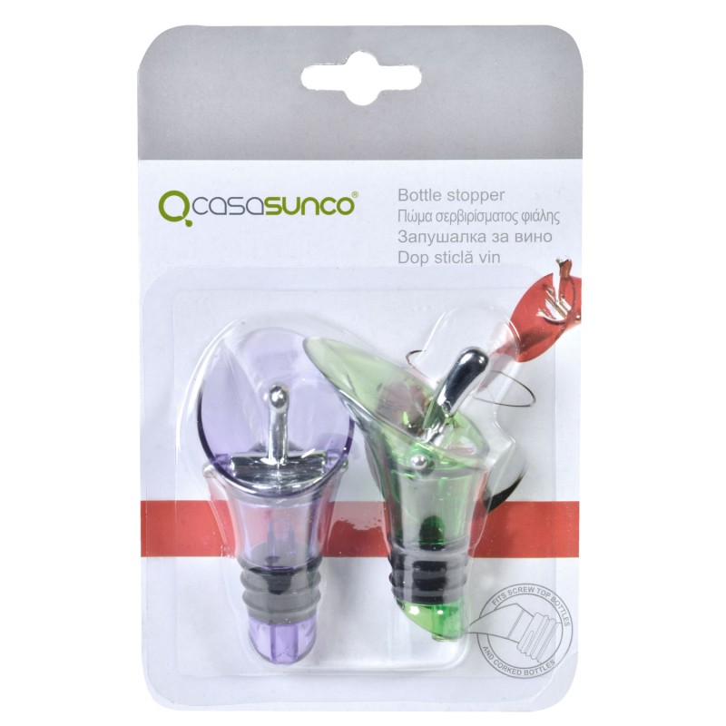 Комплект от 2 броя тапи за стъклени бутилки със специални накрайници за наливане, изработени от прозрачна пластмаса в лилаво и зелено.