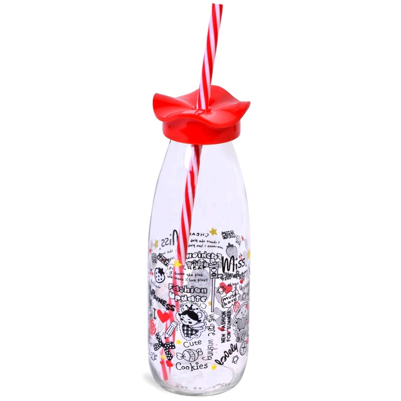 Детска бутилка, изработена от качествено прозрачно стъкло с надписи и щампа на лакомства, пластмасова вълнообразна капачка в червен цвят и сламка в червено-бяло райе.