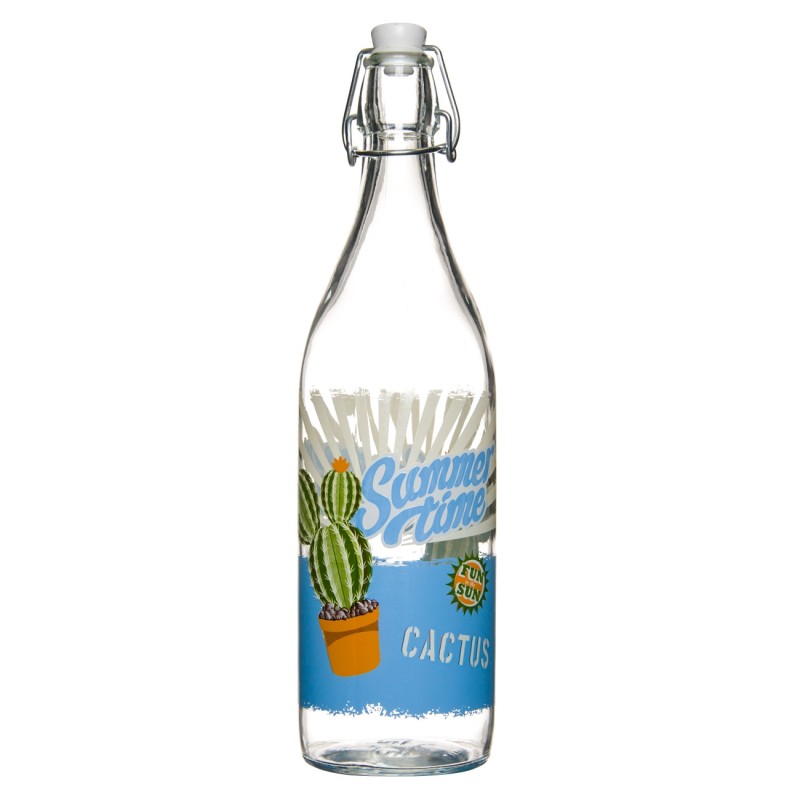 Бутилка за вода, изработена от висококачествено стъкло с ефектна щампа на кактук и подвижна запушалка в бял цвят.