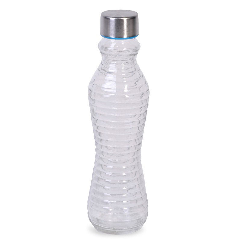 Релефна бутилка за вода, изработена от висококачествено стъкло с ергономична форма и метална капачка.