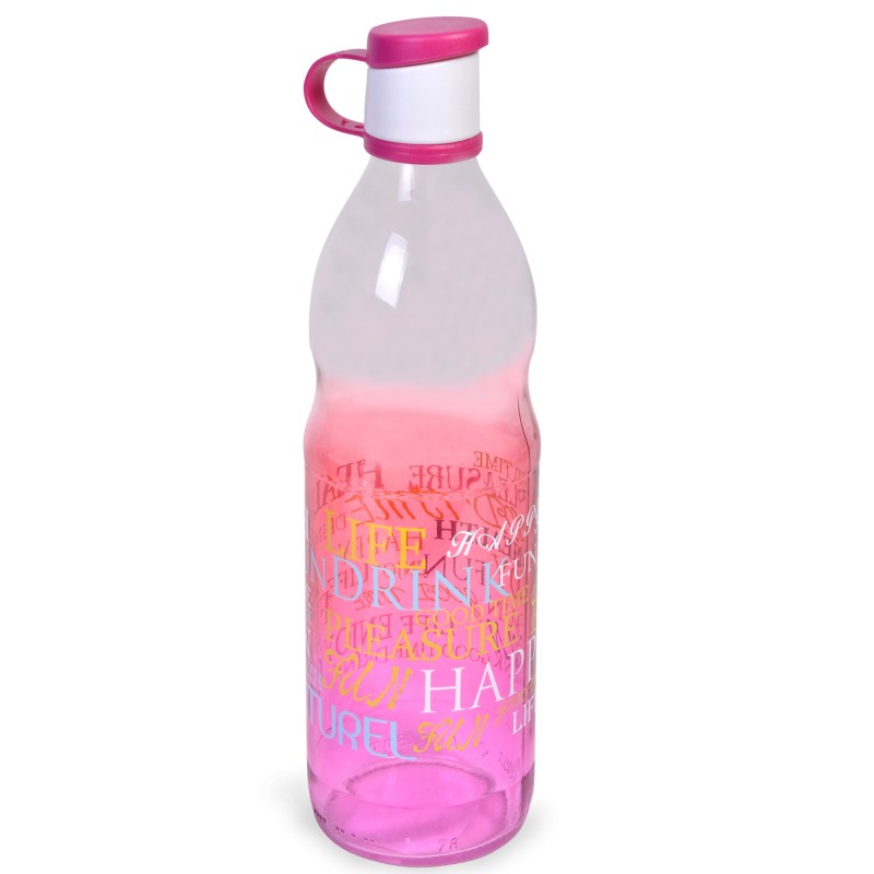 Бутилка за вода, изработена от висококачествено стъкло в розов цвят с надписи и подвижна пластмасова тапа в бяло и розово.