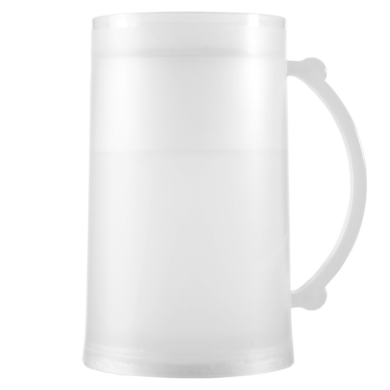 Олекотена халба за бира, изработена от качествена полупрозрачна пластмаса с двойни стени, между които има бързо замръзваща течност.