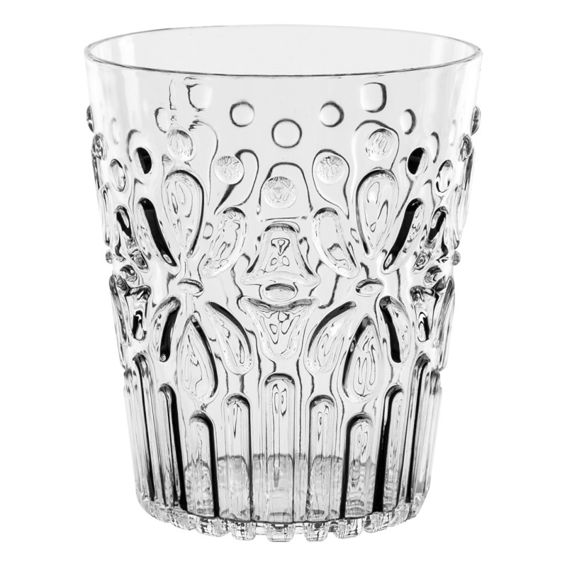 Водна чаша, изработена от качествена и здрава прозрачна пластмаса с красиви релефни флорални мотиви.