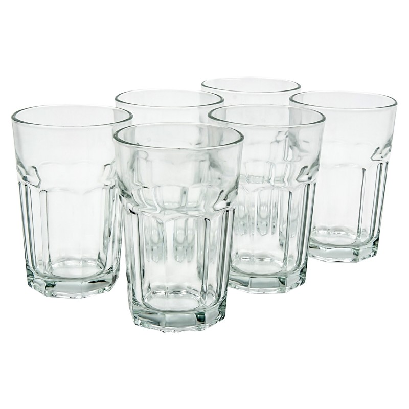 Сервиз от 6 броя водни чаши, изработени от висококачествено прозрачно стъкло с многоъгълно дъно.
