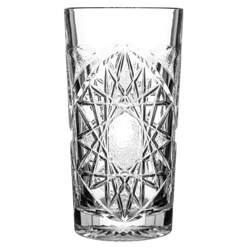 Водна чаша, изработена от висококачествено прозрачно стъкло с красив декоративен орнамент във формата на звезда.