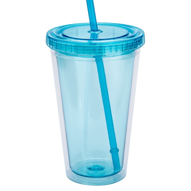 Универсална чаша, изработена от качествена прозрачна пластмаса в светло син цвят с капак и сламка.