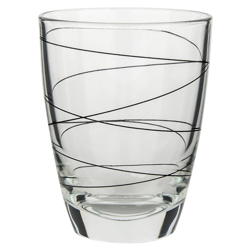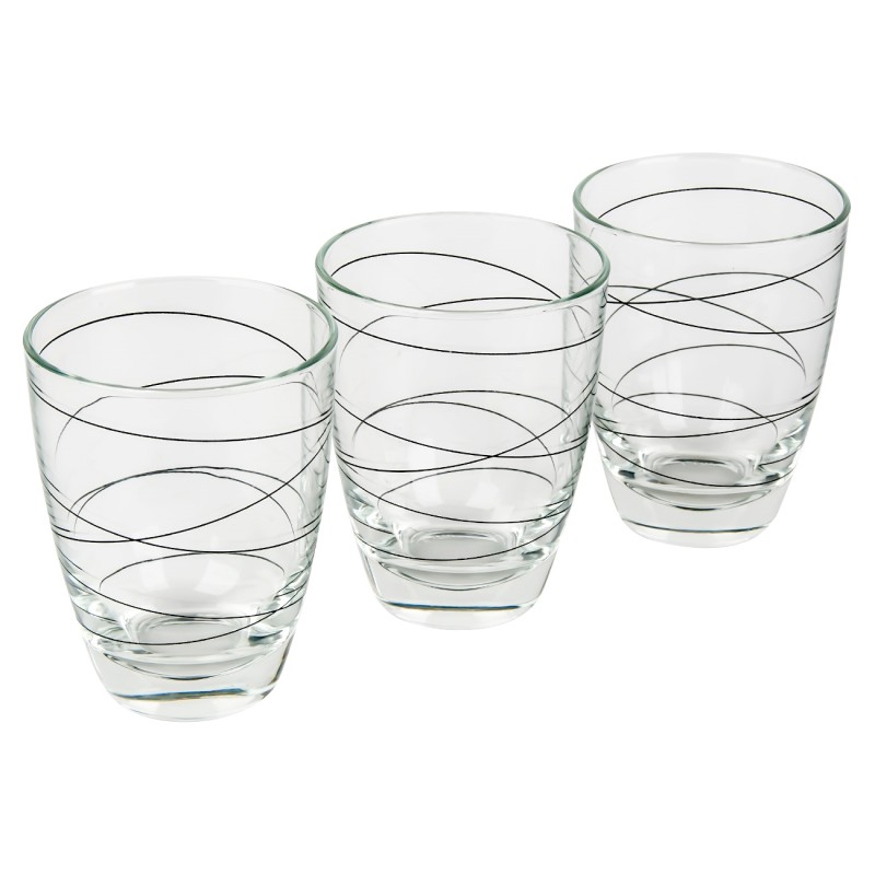 Комплект от 3 броя класически чаши, изработени от висококачествено прозрачно стъкло с декоративни черни линии и подсилено дъно.