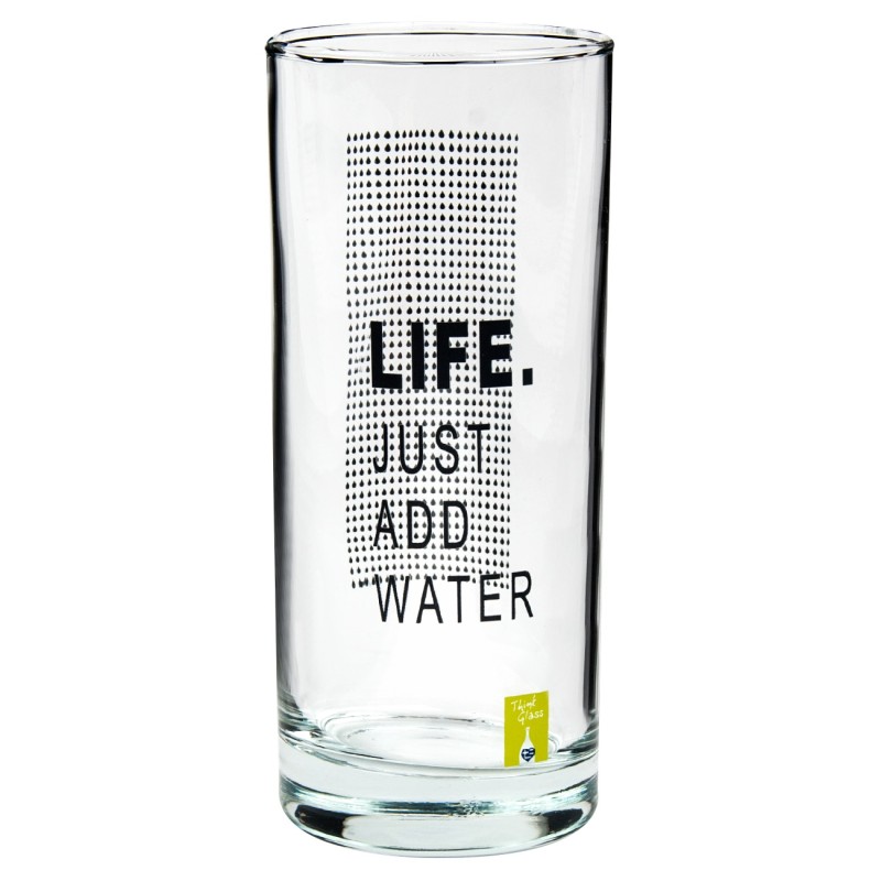 Сервиз от 6 броя класически водни чаши с цилиндрична форма, изработени от висококачествено прозрачно стъкло с надпис Life. Just add water.