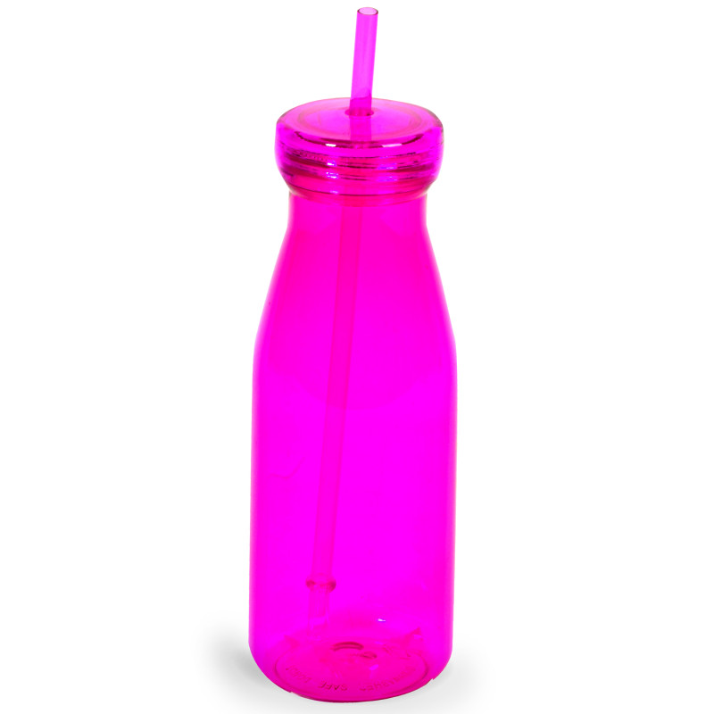 Бутилка, изработена от плътна и устойчива прозрачна пластмаса в цикламен цвят с капачка и сламка.