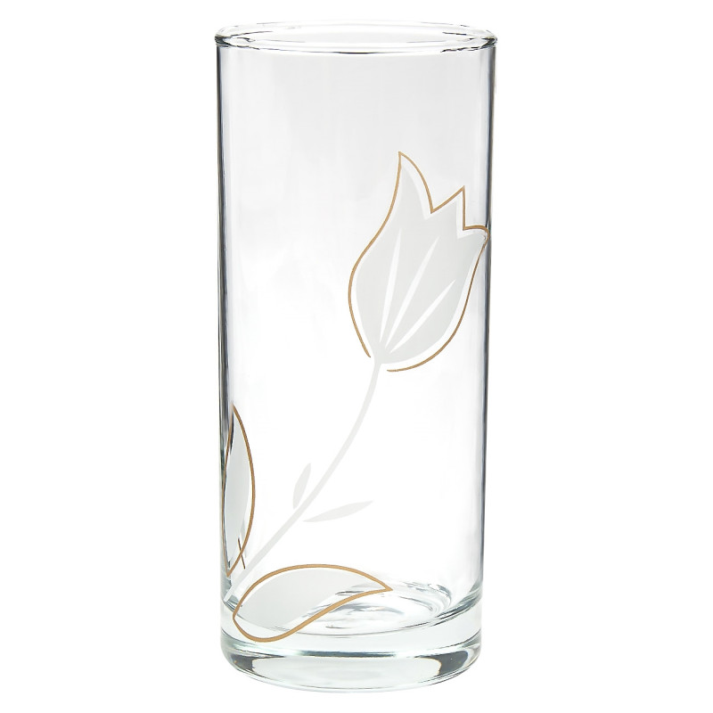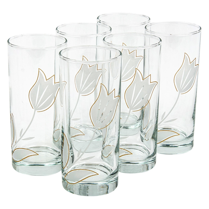 Сервиз от 6 броя универсални чаши, изработени от висококачествено прозрачно стъкло с красива щампа на лалета в бял цвят.