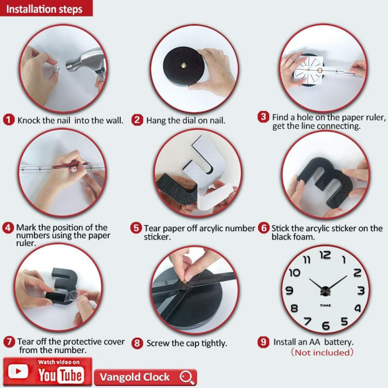 Опаковката съдържа: цифри, малка и голяма стрелка, механизъм, шаблон за монтаж