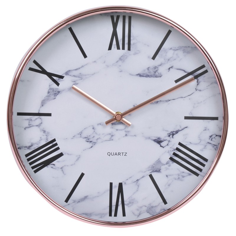 Универсален стенен часовник в кръгла форма с "мраморен" циферблат, рамка в розово и златисто и големи римски цифри в черно.