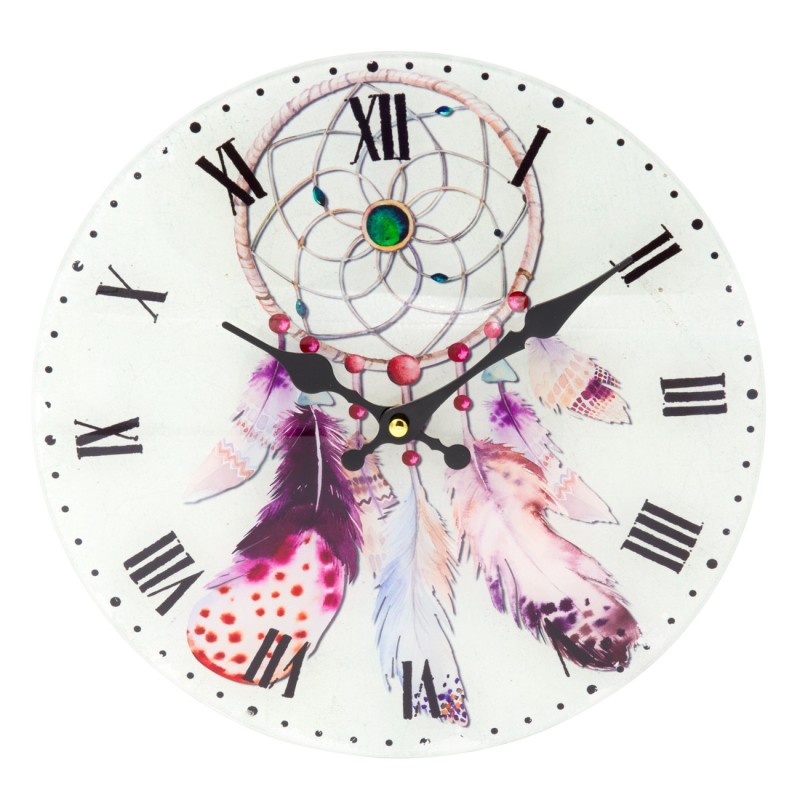 Декоративен стенен часовник с кръгла форма, изработен от стъкло в бял цвят с черни римски цифри и красива щампа на индианския амулет Ловец на сънища.