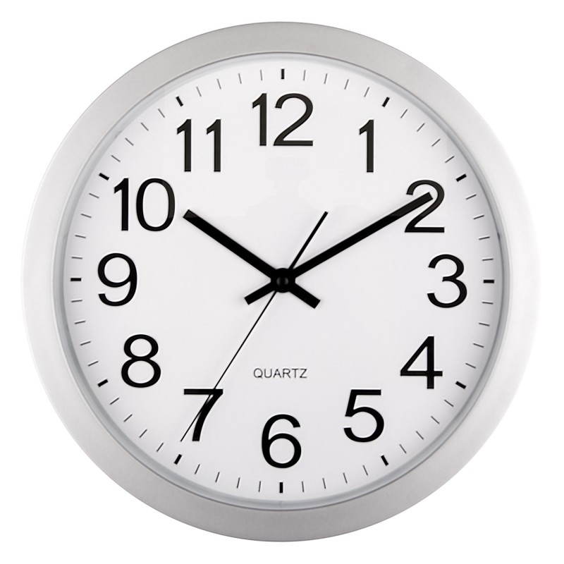 Класически стенен часовник в кръгла форма с бял циферблат, сребриста рамка и черни цифри.