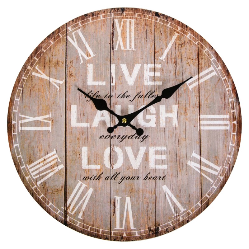 Класически стенен часовник в кръгла форма, изработен от качествена дървесина в естествен цвят с бели римски цифри и позитивно послание.