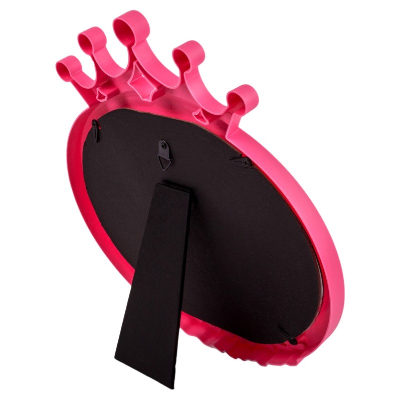 Функционално огледало с овална форма, рамка от здрава и устойчива пластмаса в розов цвят с корона, надпис Princess и стойка.