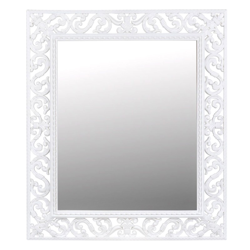 Класическо стенно огледало с правоъгълна форма и рамка от пластмаса в бял цвят с красиви декоративни орнаменти.