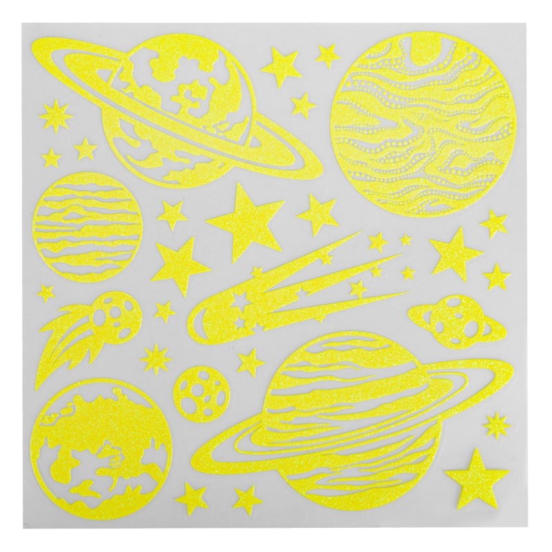 Комплект фосфоресциращи 3D стикери за стена във формата на звезди и планети, които ще превърнат детската стая в истинска светеща галактика.