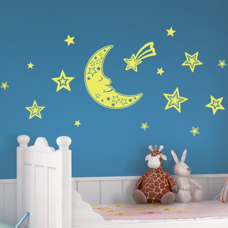 Комплект фосфоресциращи 3D стикери за стена във формата на луна и звезди, които ще превърнат детската стая в истинско звездно небе.
