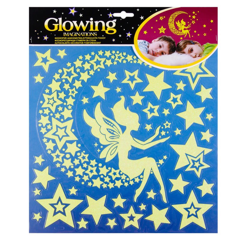 Комплект фосфоресциращи 3D стикери за стена във формата на звезди и фея, които ще пренесат магичния свят на приказките в детската стая.