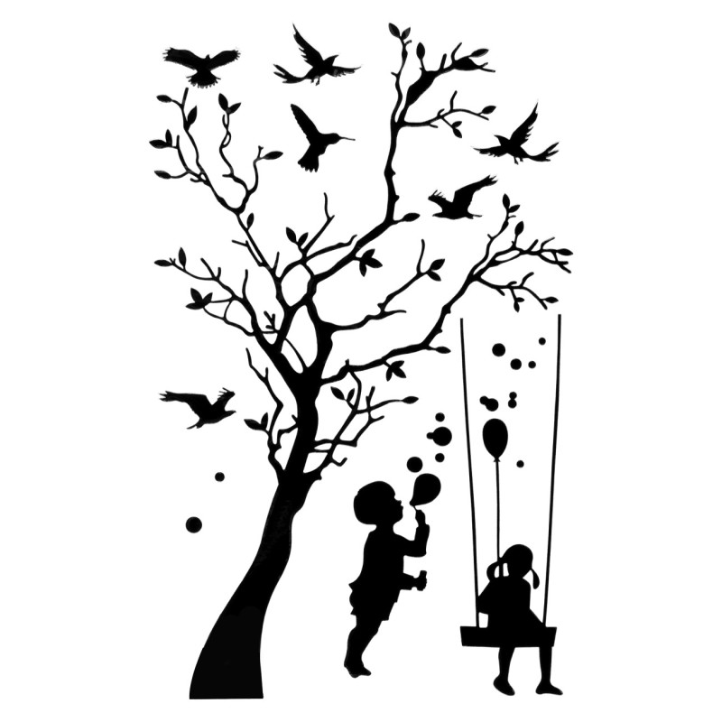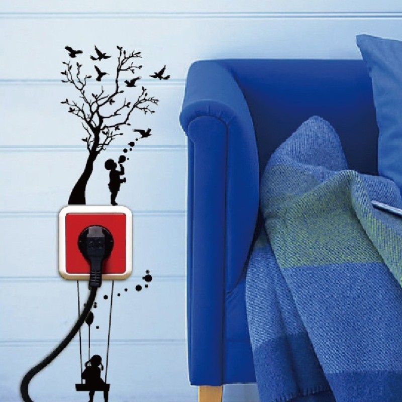 Ефектен стикер за стена във формата на дърво и люлка с деца, предназначен за декорация на електрически контакти.