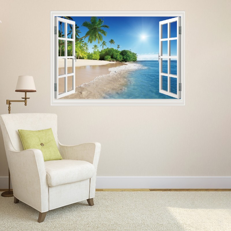 Атрактивен стикер за стена във формата на прозорец с морски пейзаж с палми.