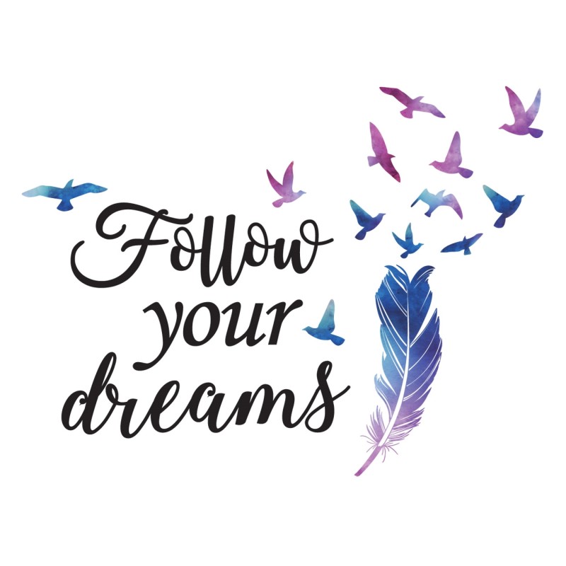 Ефектен огледален стикер с надпис Follow your dreams с декоративни птици в синьо-лилави нюанси - практичен и лесен начин да декорираш интериора и да му придадеш нов и съвременен облик.