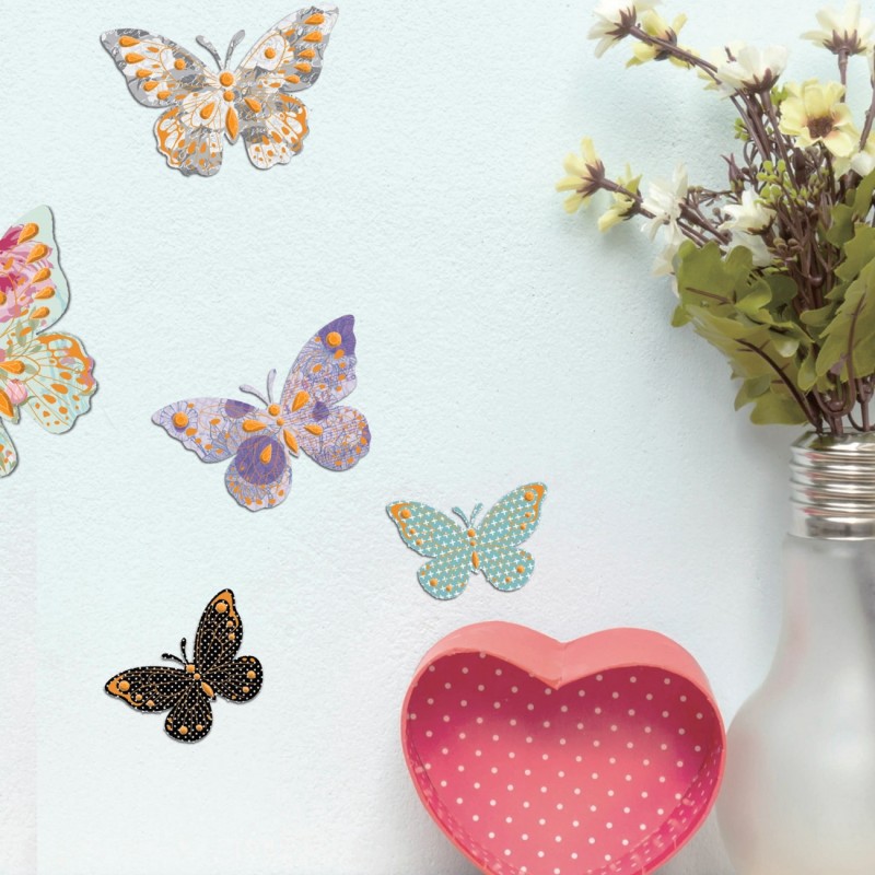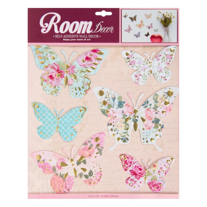 Комплект от 6 броя стикери за стена от акрил във формата на пеперуди с цветни флорални мотиви и красиви златисти детайли.