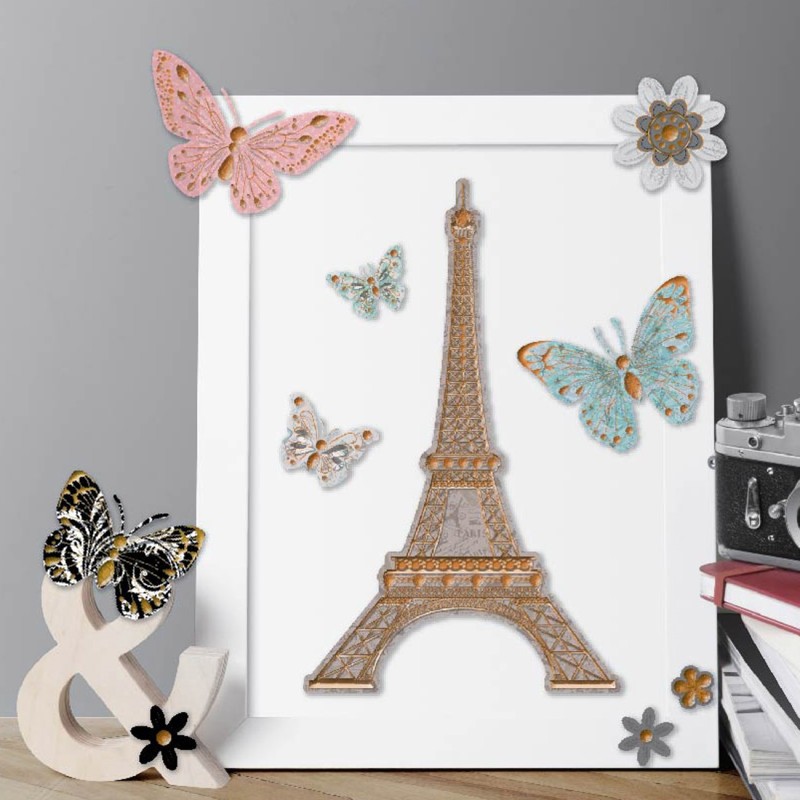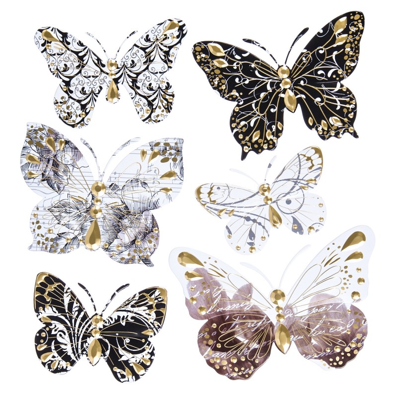 Комплект от 6 броя стикери за стена от акрил във формата на пеперуди с флорални мотиви и красиви златисти детайли.