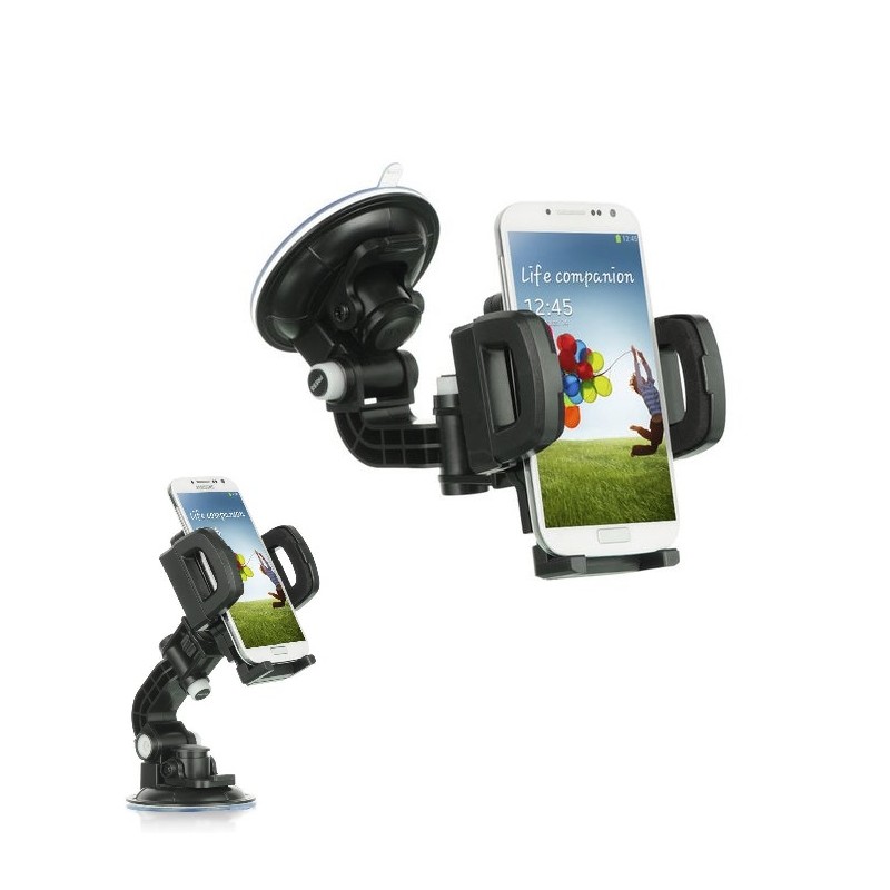 Универсална поставка за телефон и други мобилни устройства. Подходяща за поставяне в автомобила, на съклото, на таблото или всякаква гладка повърхност.