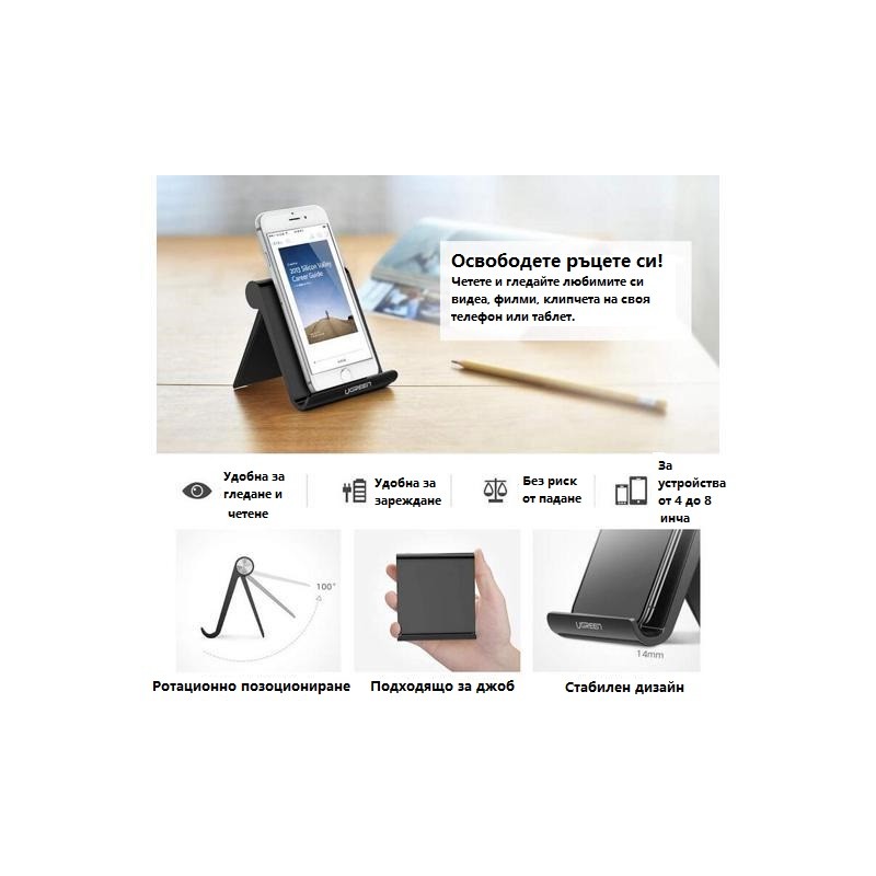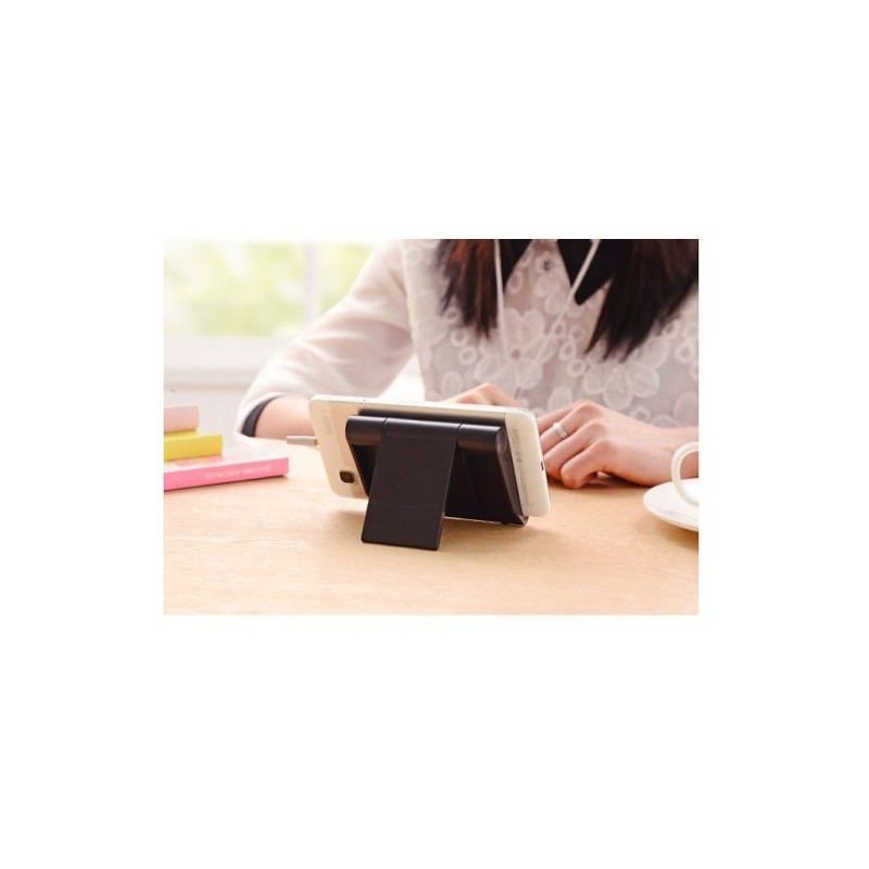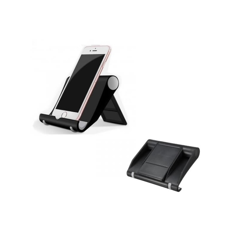 Компактна поставка за телефон или таблет. Разполага с ротационно рамо със 270 градусов обхват. По този начин може да поставяте телефона си в най-удобната за Вас позиция. Стойката се сгъва компактно, което я прави лесна за съхранение и пренасяне навсякъде с Вас.