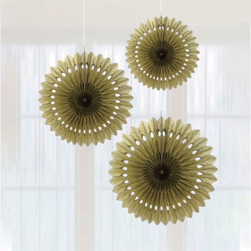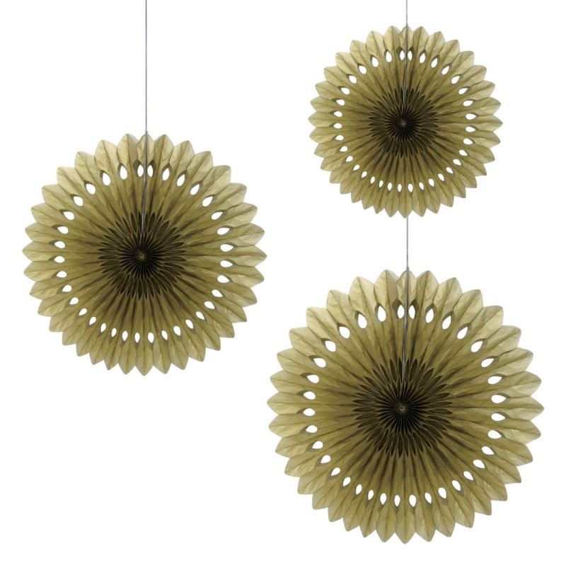 Комплект от 3 броя висящи парти декорации във формата на ветрило, изработени от хартия в златист цвят.