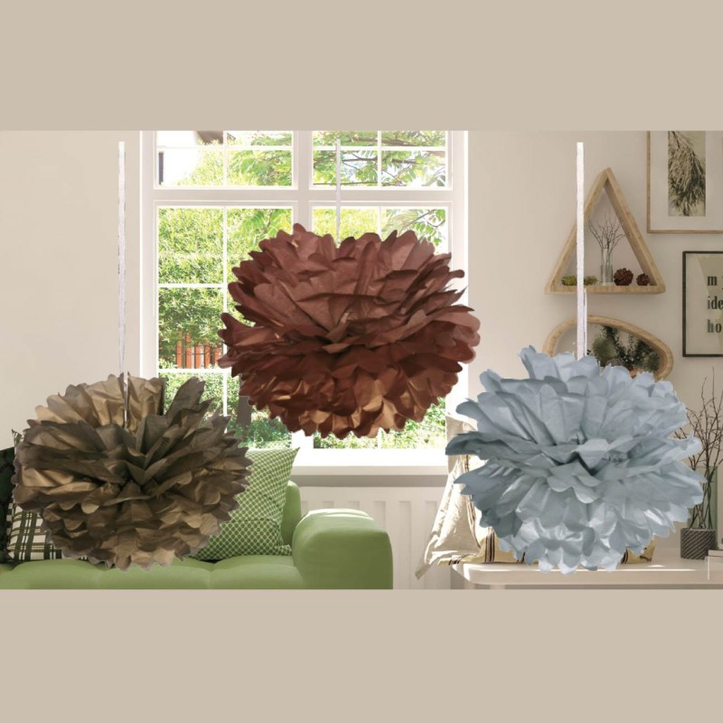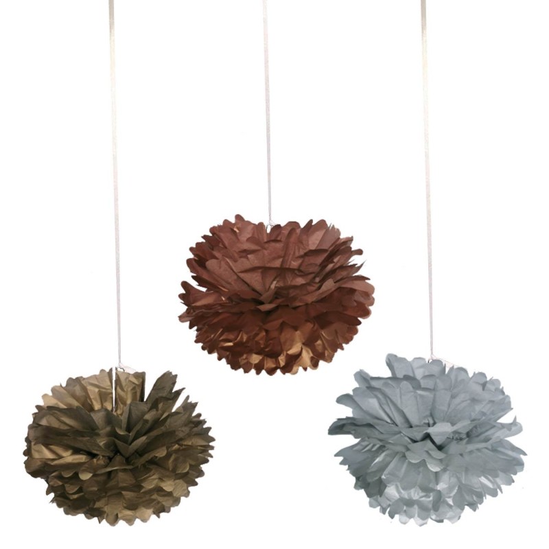 Комплект от 3 броя висящи парти декорации във формата на помпони, изработени от хартия в цвят злато, сребро и бронз.