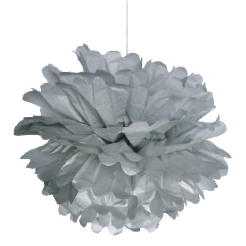 Висяща парти декорация във формата на помпон, изработена от хартия в сребрист цвят.