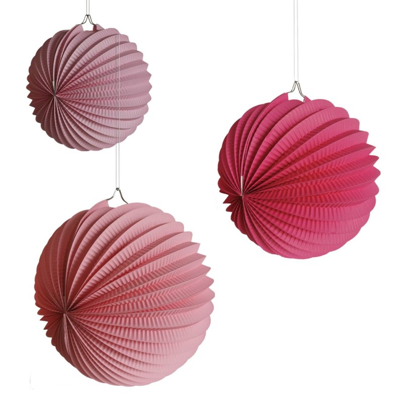 Комплект от 3 броя висящи парти декорации във формата на топка, изработени от хартия в розови нюанси с телена рамка, за да стоят отворени.