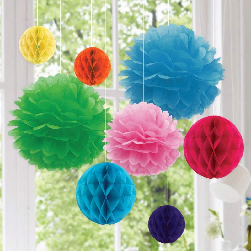 Комплект от 8 броя висящи парти декорации във формата на топки и помпони, изработени от хартия в различни ярки цветове.