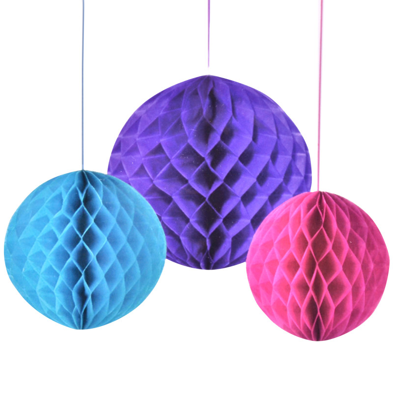 Комплект от 3 броя висящи парти декорации във формата на топка, изработени от хартия в цвят тюркоаз, лилаво и цикламено.