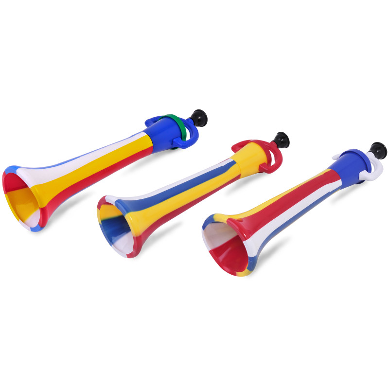 Парти тромпет, изработен от пластмаса в многоцветно райе, който издава звук.