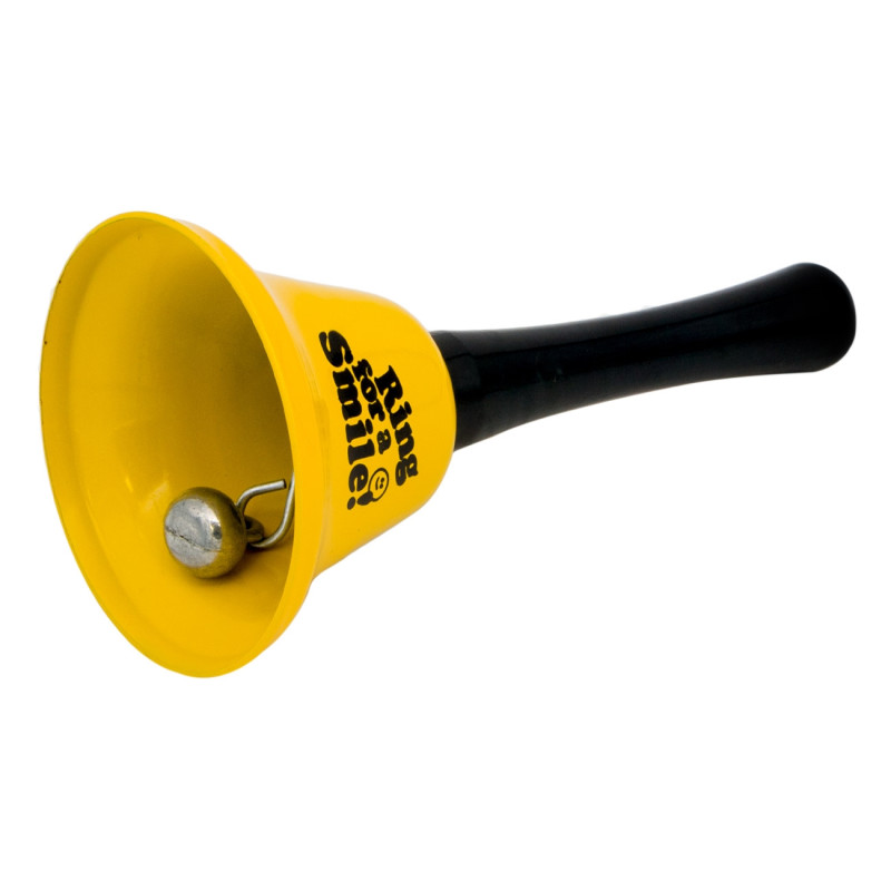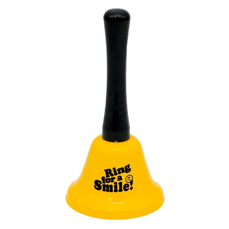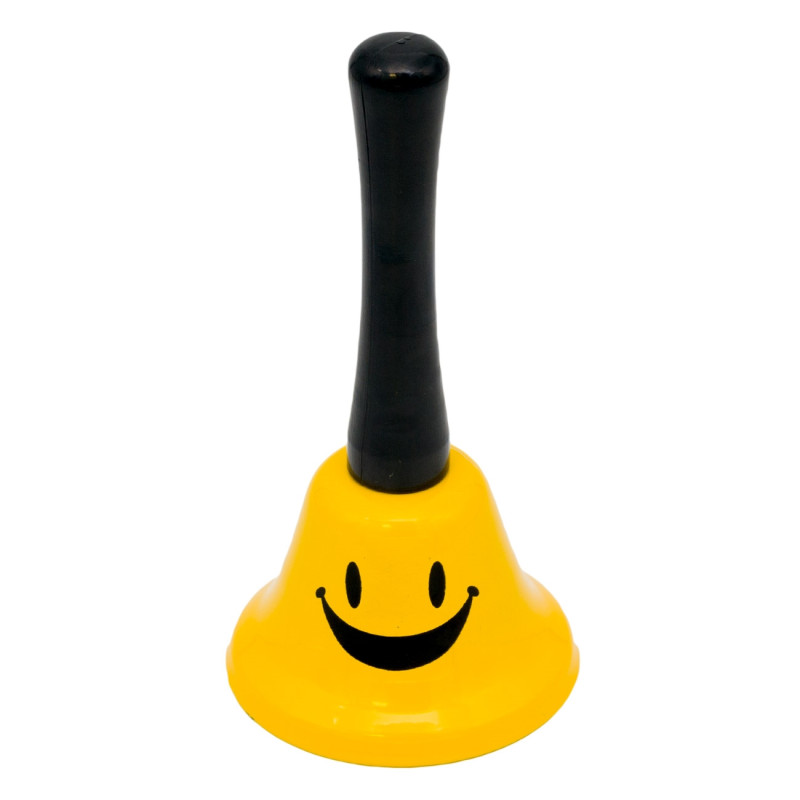 Парти звънче с дръжка, изработено от метал в жълт цвят с усмихнато лице.