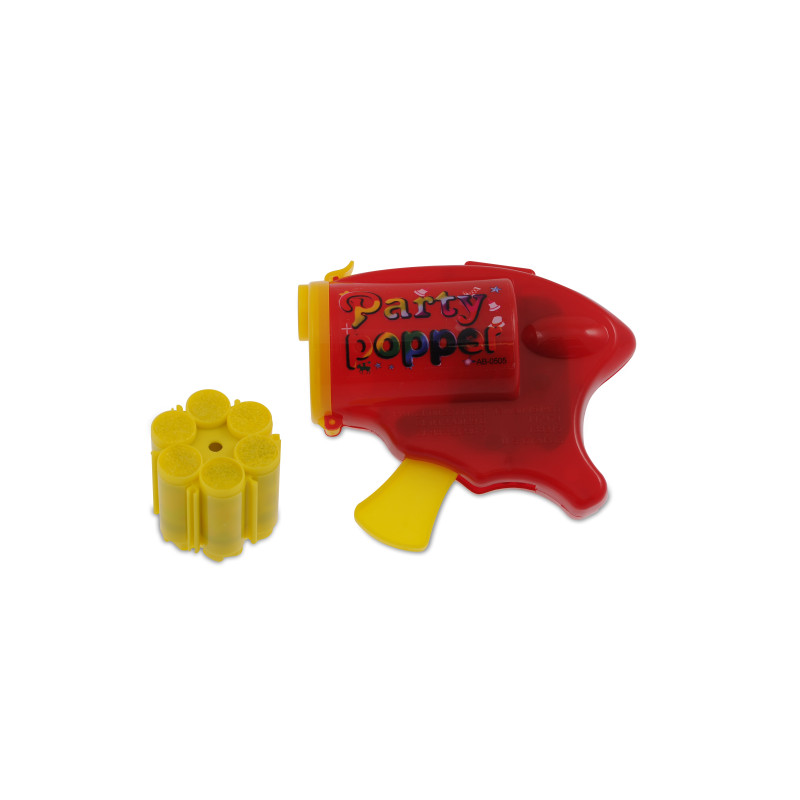 Парти пистолет, изработен от пластмаса в червено и жълто, който изстрелва 6 изстрела с разноцветни конфети.