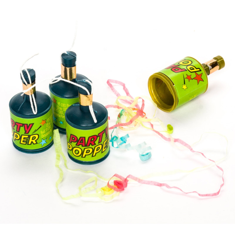 Комплект от 4 броя мини цилиндри с многоцветни лентички и конфети, които се изстрелват с дръпване на връзката.