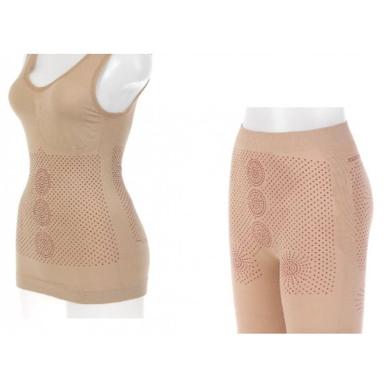 Нов комплект 3 в 1 турмалинов отслабващ комплект - корсет, клин и бикини. Турмалиновото отслабващо бельо е изработено от Celluflex - уникална комбинация от нов вид текстил, с биокристали турмалин и множество магнитни акупунктиращи бутончета, които ускоряват метаболизма и така подпомагат отслабването, спомагат за отстраняването на токсините, горят калориите, ускоряват премахването на портокаловата кожа и моделират вашето тяло без да се мъчите с диети или интензивни тренировки.