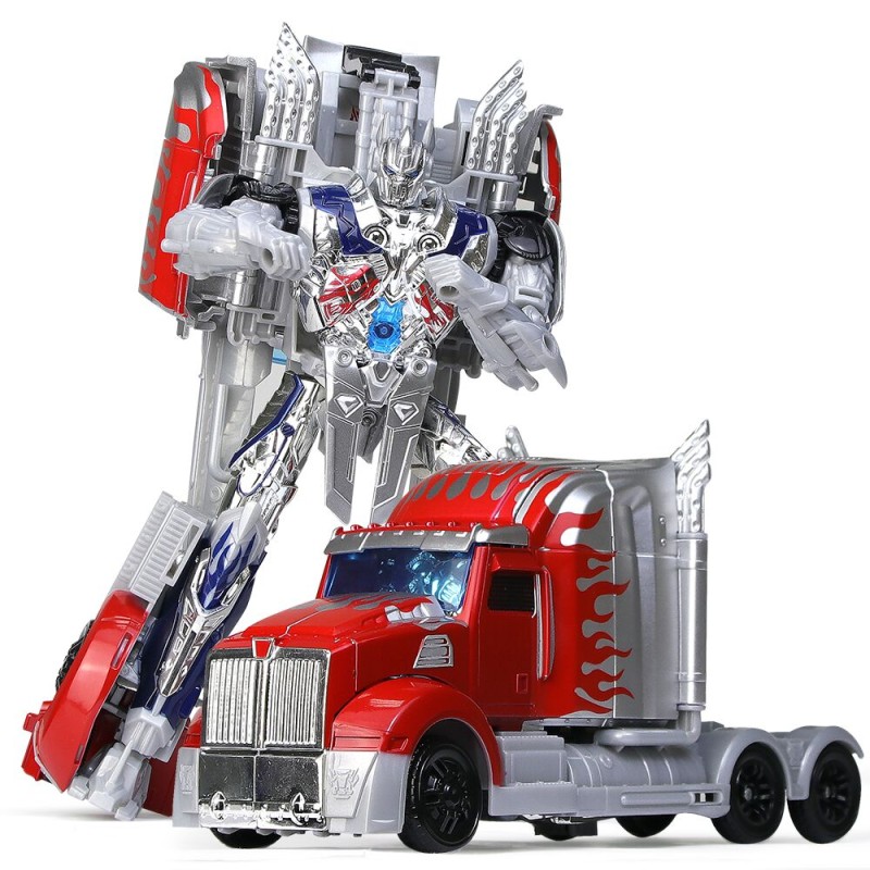 Детска играчка робот в сребристо и червено, който се превръща в камион за безкрайни часове игри и забавления.