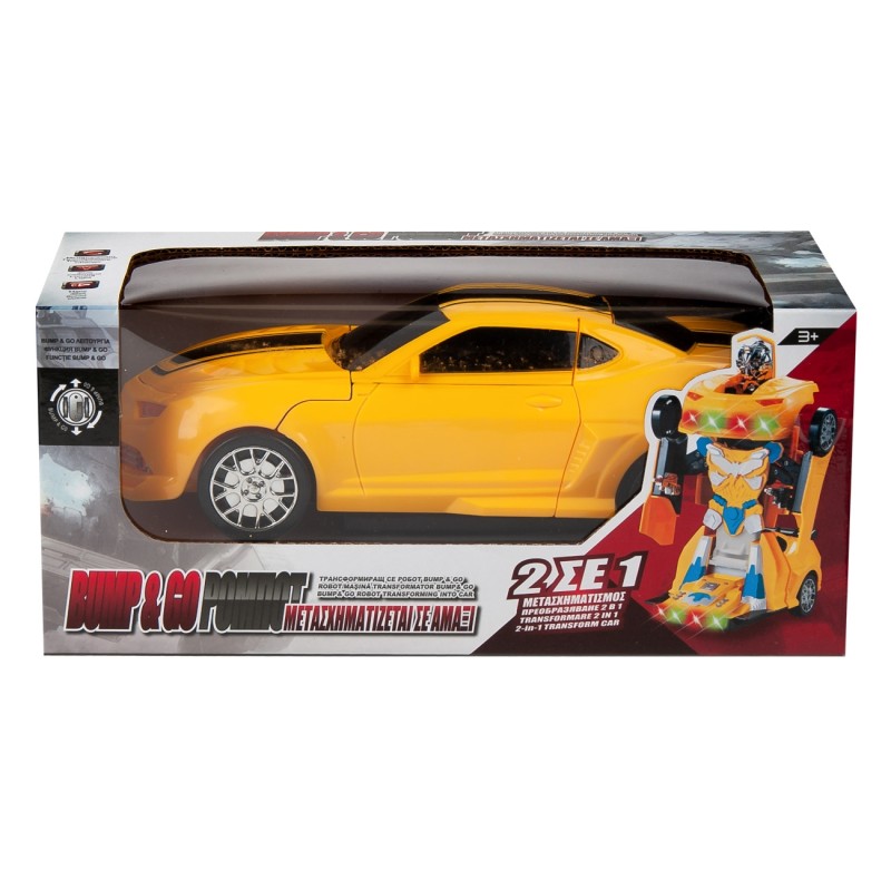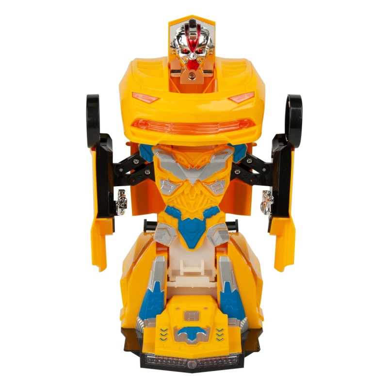 Детска играчка автомобил в жълт цвят, който се превръща в робот със звук, светлини и движение във всички посоки.