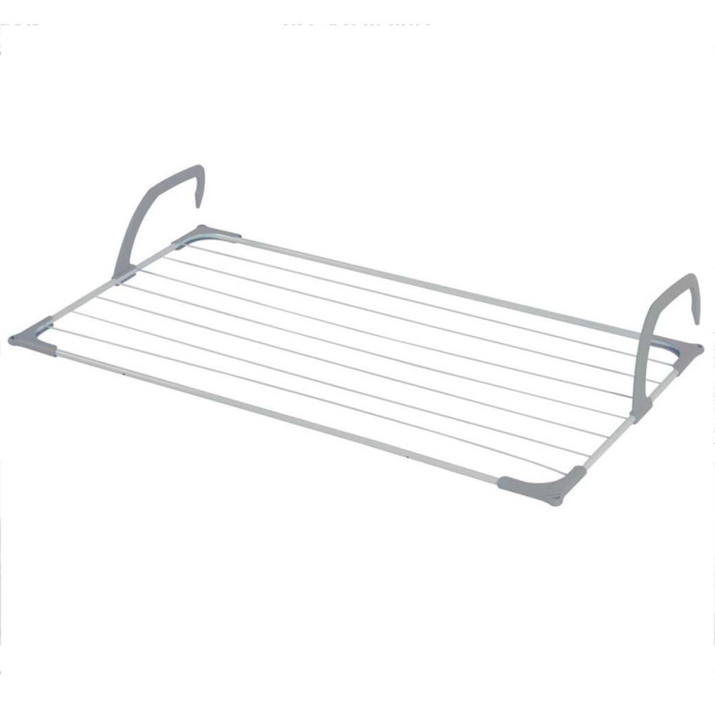 Голям висящ сушилник за дрехи, изработен от неръждаема метална сплав с пластмасови закачалки.